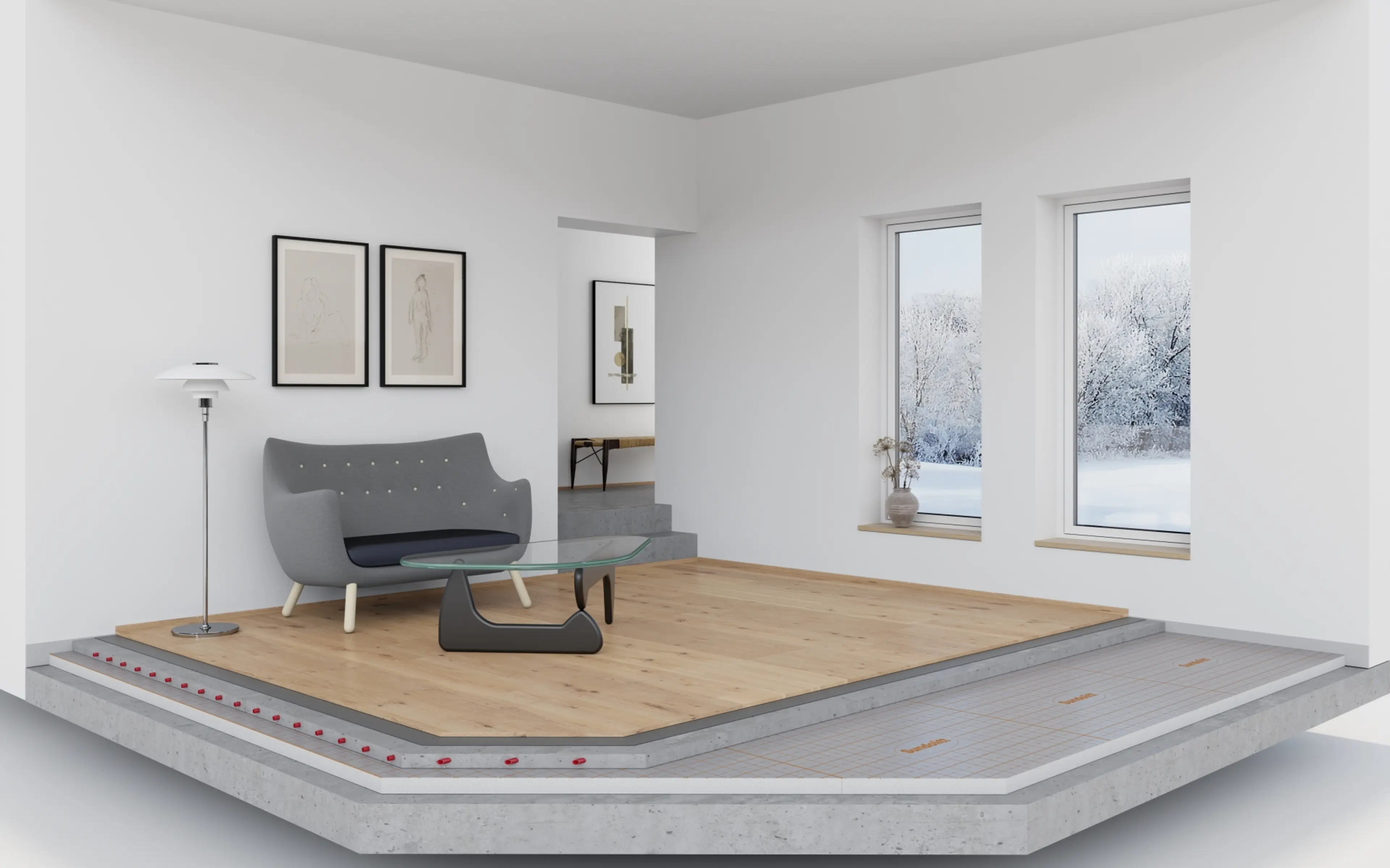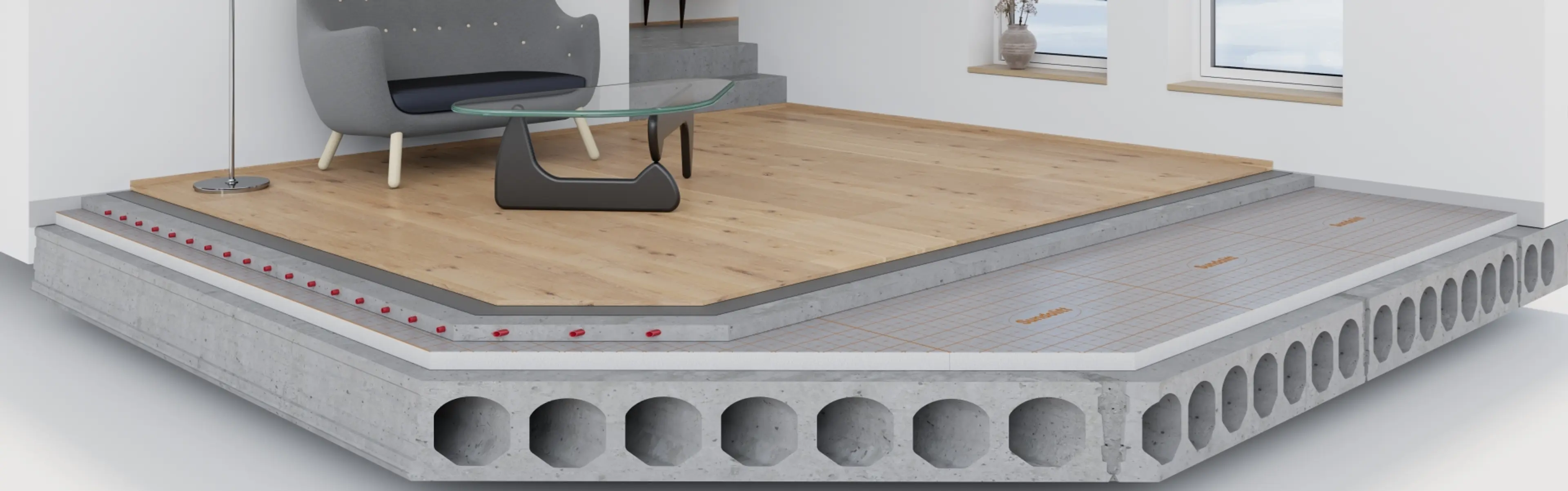 Trinnlydplater i EPS gir god lyddemping av trinnlyd. Platene leveres i flere tykkelser og legges på et plant underlag med påstøp på minst 35 mm oppå og gjerne med vannbåren varme. Platene monteres med kantlist mot vegg for å oppnå oppgitt lydegenskaper.